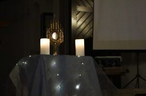 A lelkigyakorlat csúcspontja talán a Szentségimádás volt, másnap ezt is többen felelevenítették. A szép dicsőítő Szentségimádások általában nagyon megérintenek. Sokszor sírok is, bár nem szeretnék. Mélyen átjárnak a dalszövegek, és, bár képtelen vagyok énekelni, mintha tőlem szállnának, úgy vagyok az Úr előtt. A csöndes Szentségimádás valahol levezetése a dicsőítésnek, de egyben bevezetés is a mélyebb rétegekbe. Az ember szemtől szemben lehet Jézussal, Aki ezeknek a csöndes perceknek, óráknak nagyon örül. Neki nem kell félhomály és gyertyalángok vagy csillagfény hogy nyugodtan, szeretettel tudjon a szemünkbe nézni, megölelni, mély beszélgetésbe kezdeni. Nekünk talán segítenek ezek a körülmények. Neki csak mi kellünk.