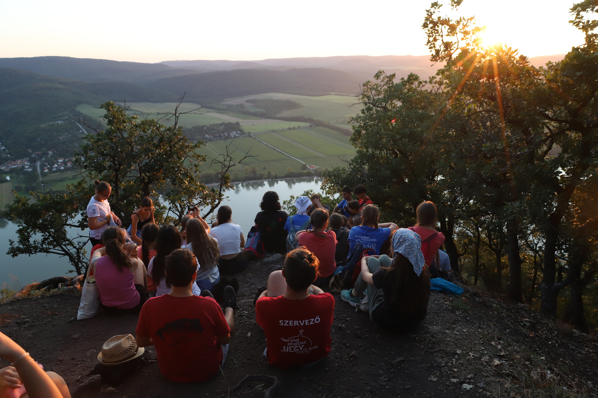 Másnap reggel egyenesen Konstantin császár udvaráig utaztunk, majd az I. Nagymarosi Zsinat tanúi lehettünk. Közelebbről megismertük a Hitvallást, végiggondoltuk, miben is hiszünk valójában. A kiscsoportban feltehettük a kérdéseinket és egymás értékes gondolataival gazdagodtunk. Délután vizes sorverseny következett és a nagy melegben természetesen a fagyizás sem maradhatott el. Egy biztos: senki nem maradt szárazon! Kora este különleges útra indultunk: aznapi szentmisénket a Dobozi-oromnál, naplementében ünnepeltük. Csodálatos volt a Dunakanyarral a háttérben, a lemenő nap fényében részt venni a liturgián. Mindnyájunknak életre szóló élmény marad! A visszafelé utat fejlámpákkal tettük meg: itt aztán tényleg megtanultunk közösségként haladni! A fiúkra még ezután is várt egy jó nagy kaland: polifoam, hálózsák, pizsama és határ a csillagos ég!